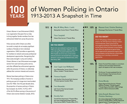 In celebration of International Women's Day and OWLE's 20th Anniversary, a timeline showcasing the groundbreaking achievements of women in policing was created and is now proudly displayed at the Ontario Police College.